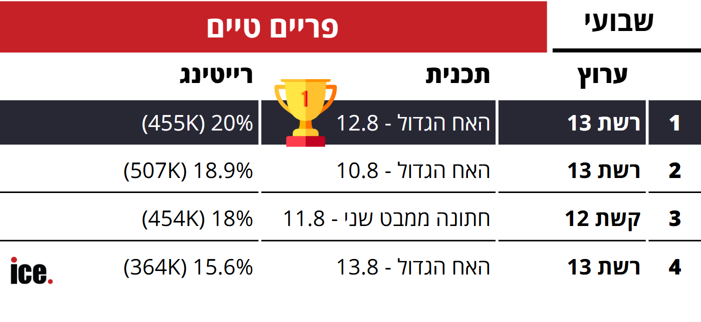 לפי דירוג הרייטינג השבועי של ice, על ימי ראשון-חמישי, "האח הגדול" מבית רשת 13 שומר על יציבות מרשימה בפסגה, ונוצץ בשני המקומות הראשונים. הקשר של יובל ושני מהבית המפורסם במדינה כבש את לב הצופים, ובשיא השבועי, 20% רייטינג (455 אלף צופים לתכנית האח הגדול ששודרה ביום שלישי.