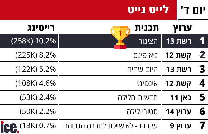 בגזרת הלייט נייט אין הפתעות, כאשר מי שממשיכה לשלוט בה היא רשת 13 והצינור, שהשיגו 10.2%. ערב טוב עם גיא פינס גורפת 8.2%, היום שהיה גם כן ברשת עם 5.2%, חדשות הלילה בכאן 11 עם 2.4%, ובמקום האחרון - סטורי לילה בערוץ 14 רק עם 2.2%.