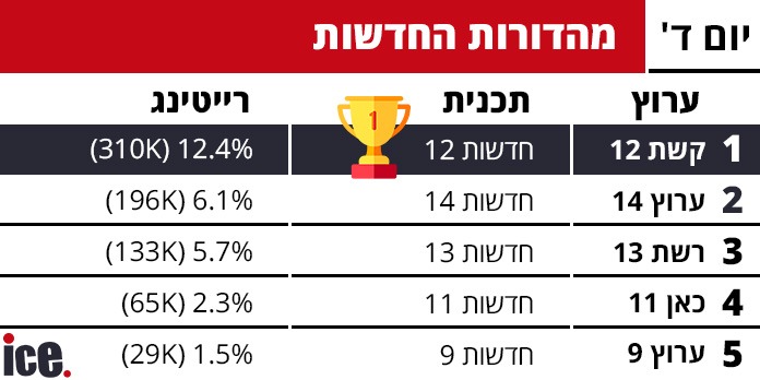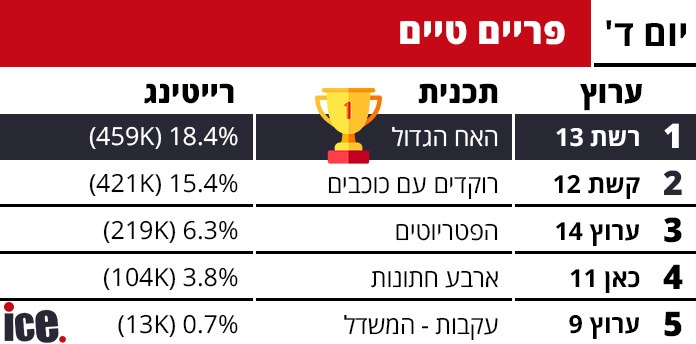 הקרב על הרייטינג בין הערוצים הגדולים בישראל נמשך אתמול (רביעי) כאשר כמדי יום, האח הגדול ורשת 13 ממשיכים לשלוט בפריים טיים אחרי שהשיגו נתונים מרשימים של 18.4% (459 אלף צופים).