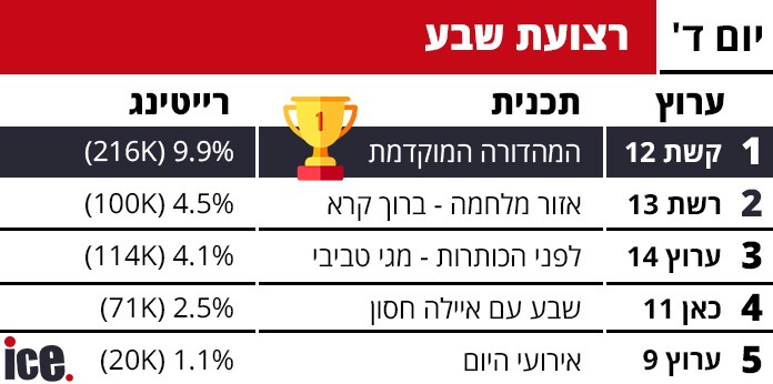 רוקדים עם כוכבים בקשת 12 מנסה להשיב מלחמה למלכת הרייטינג מרשת, ורשמו נתונים יפים גם הם בדמות 15.4% (421 אלף צופים). הפטריוטים נותרו הרחק מאחור עם 6.3% (219 אלף צופים), שלא נדבר עם כאן 11, שמסיימת אחרונה בפריים טיים כאשר התוכנית ארבע חתונות גרפה 3.8% (104 אלף צופים) בלבד.