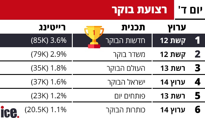 ברצועת הבוקר שולטת קשת 12, כאשר התוכנית חדשות הבוקר עם ניב רסקין השיגה 3.6%. אחרי שהעולם הבוקר ברשת 13 עם 1.8%, ובצמוד אליה ישראל הבוקר בערוץ 14 עם 1.6%.