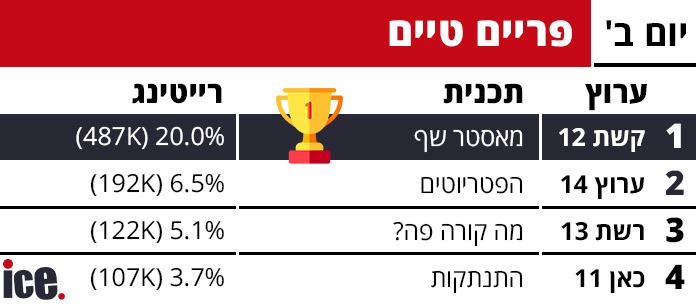 הפתעה ברצועת הפריים טיים כאשר תכנית הבכורה של מאסטר שף בקשת 12 עלתה על כל הציפיות ורשמה רייטינג פנטסטי של 20% עם 488 אלף צופים - השקה הגבוהה ביותר של התכנית ב-6 השנים האחרונות. הישג זה מותיר את שאר המתחרים הרחק מאחור: ערוץ 14 הציג שתי תכניות - "הפטריוטים" עם 6.5% ו-192 אלף צופים ו"זמרי ופליישמן" עם 4.6% ו-145 אלף צופים. רשת 13 הציגה את "מה קורה פה" עם 5.1% ו-122 אלף צופים, בעוד כאן 11 חילקה את זמנה בין "התנתקות" (3.7% ו-107 אלף צופים) ו"שיר אחד" (2.5% ו-64 אלף צופים).