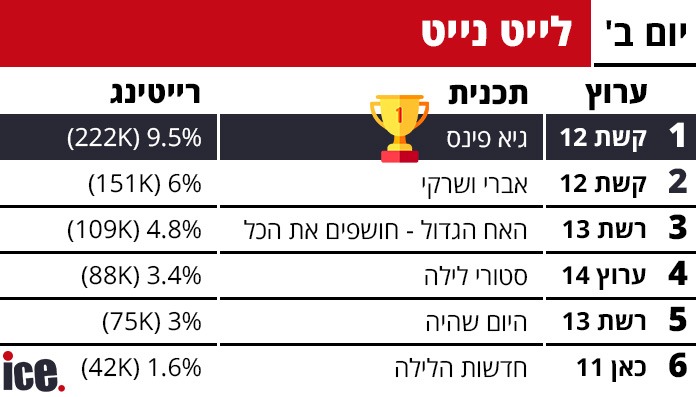 ברצועת הלייט, קשת 12 ממשיכה להוביל עם תכנית "גיא פינס" שרשמה 9.5% עם 222 אלף צופים, ואחריה "אברי ושרקי" עם 6.0% ו-151 אלף צופים. רשת 13 הציגה את "האח הגדול חושפים הכל" (סיפורו של קאזם חליליה) עם 4.8% ו-109 אלף צופים, ו"היום שהיה" עם 3.0% ו-75 אלף צופים. ערוץ 14 רשם 3.4% ו-88 אלף צופים עם "סטורי לילה", בעוד כאן 11 סגרה עם "חדשות הלילה" - 1.6% ו-42 אלף צופים בלבד.