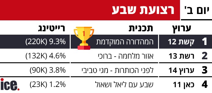 כמובן שחדשות 12 מחזיקה בכתר בלתי מעורער. המהדורה המרכזית של קשת 12 רשמה רייטינג מרשים של 13.4% עם 302 אלף צופים, מה שמעמיד אותה הרחק מעבר למתחרות. ערוץ 14 הגיע למקום השני עם 6.0% ו-146 אלף צופים, בעוד רשת 13 זוכה למקום השלישי עם 4.7% ו-135 אלף צופים. כאן 11 סוגרת את הרשימה עם 3.2% ו-74 אלף צופים בלבד.