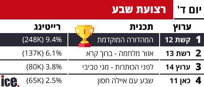 במקום הראשון במדרג הרייטינג של רצועת השבע ניצבת "המהדורה המוקדמת" עם רייטינג מרשים של 9.4% ו-248 אלף צופים. התכנית מוכיחה כי היא מצליחה לשמור על מעמדה כמובילה ברצועה התחרותית הזו. במקום השני מופיעה "איזור מלחמה - ברוכי קרא" עם 6.1% ו-137 אלף צופים, המציגה נתוני צפייה יציבים. התכנית "לפני הכותרות - מגי טביבי" תופסת את המקום השלישי עם 3.8% ו-80 אלף צופים. "שבע עם איילה חסון" עם 2.5% ו-65 אלף צופים, המשדרת בערוץ כאן 11