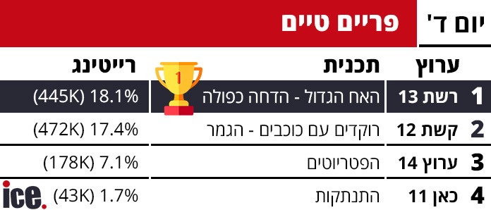 ברצועת הפריים טיים ניצחה "האח הגדול - דרמה כפולה" עם רייטינג גבוה של 18.1% ו-445 אלף צופים, בעוד "רוקדים עם כוכבים - הגמר" עם 17.4% ו-472 אלף צופים, שהוכיח כי העונה הזו יש רק ריאליטי אחד ששולט