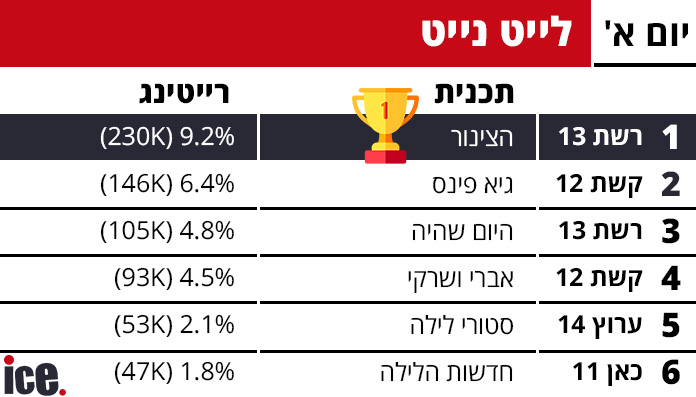 ברצועת הלילה, רשת 13 הובילה עם שתי תוכניות: "הצינור" ברייטינג מרשים של 9.2% ו-230 אלף צופים, ו"היום שהיה" עם 4.8% ו-105 אלף צופים. קשת 12 התפצלה בין "גיא פינס" שהשיג 6.4% ו-146 אלף צופים לבין "אברי ושרקי" עם 4.5% ו-93 אלף צופים. ערוץ 14 הגיע ל-2.1% ו-53 אלף צופים עם "סטורי לילה", בעוד כאן 11 נותר אחרון עם "חדשות הלילה" - 1.8% ו-47 אלף צופים.