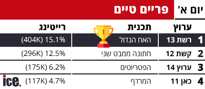 האח הגדול" של רשת 13 המשיך בדומיננטיות שלו ברצועת הפריים טיים עם 15.1% נתח צפייה ו-404 אלף צופים. "חתונה ממבט שני" של קשת 12 הציגה התאוששות מרשימה אבל עדיין רחוקה מהשליטה של הרצועה