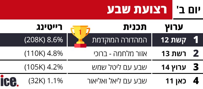 ברצועת השידור של השעה 19:00, קשת 12 מובילה בביטחון עם "המהדורה המוקדמת" בהגשת קרן מרציאנו שזוכה ל-8.6% רייטינג ו-208 אלף צופים. רשת 13 במקום השני עם "אזור מלחמה" בהגשת ברוכי (4.8%, 110 אלף צופים), ואחריה ערוץ 14 עם "שבע" בהגשת ליטל שמש (4.2%, 105 אלף צופים). כאן 11 נמצאת במקום האחרון עם "שבע" בהגשת ליאל קייזר ואליאור לוי - 1.1% רייטינג ו-32 אלף צופים.