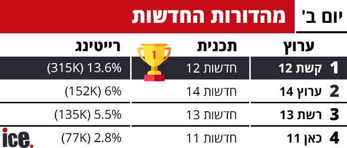 במאבק על מהדורות החדשות המרכזיות, חדשות 12 שומרת על המקום הראשון עם 13.6% רייטינג ו-315 אלף צופים. חדשות 14 תופסת את המקום השני עם 6% רייטינג ו-153 אלף צופים, ואחריה חדשות 13 עם 5.6% ו-135 אלף צופים. חדשות 11 נמצאת במקום האחרון עם 2.8% רייטינג ו-77 אלף צופים.