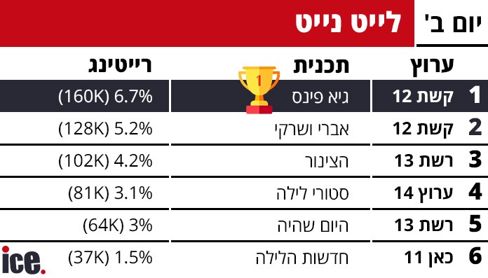 ברצועת הלייט, קשת 12 מובילה עם "גיא פינס" שהשיגה 6.7% רייטינג ו-160 אלף צופים, ואחריה "אברי ושרקי" עם 5.2% ו-128 אלף צופים. רשת 13 מתמקמת במקום השני עם "הצינור" (4.2%, 102 אלף צופים) ו"היום שהיה" (3%, 64 אלף צופים). ערוץ 14 רושמת 3.1% רייטינג ו-81 אלף צופים עם "סטורי לילה", בעוד כאן 11 סוגרת עם "חדשות הלילה" - 1.5% ו-37 אלף צופים.
