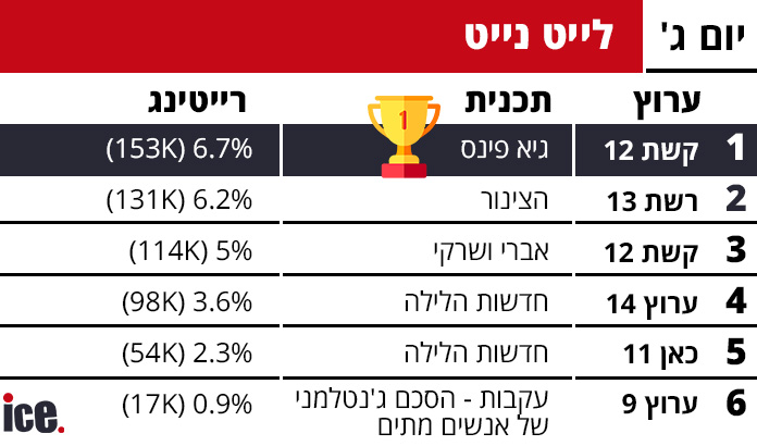 ברצועת הלייט המאוחרת הוביל גיא פינס בקשת 12 עם 6.7% ו-153 אלף צופים, ואחריו "הצינור" ברשת 13 עם 6.2% ו-131 אלף צופים. במקום השלישי הגיעה תכנית "אברי ושרקי" בקשת 12 עם 5% ו-114 אלף צופים. חדשות הלילה בערוץ 14 רשמה 3.6% ו-98 אלף צופים, בעוד חדשות הלילה בכאן 11 סגרה את הרשימה עם 2.3% ו-54 אלף צופים בלבד.