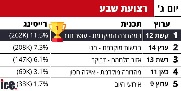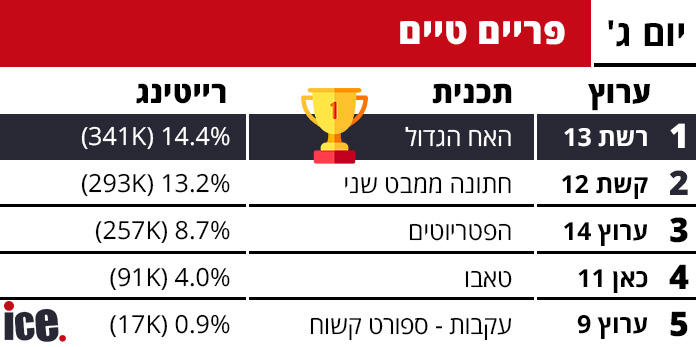 ברצועת הפריים טיים המובחרת השתלטה רשת 13 על המקום הראשון עם "האח הגדול" שזכה לרייטינג של 14.5% ו-342 אלף צופים. במקום השני הגיעה קשת 12 עם "חתונה ממבט שני" שרשמה 13.2% ו-294 אלף צופים. ערוץ 14 התמקם במקום השלישי עם "הפטריוטים" שגרף 8.7% ו-256 אלף צופים, בעוד כאן 11 עם "טאבו" הסתפקה ב-4% ו-92 אלף צופים.