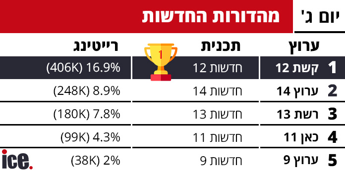 חדשות 12 מובילה במהדורה המרכזית, "האח הגדול" שולט בפריים טיים ונראה שלפחות שם אין לרשת 13 תחרות