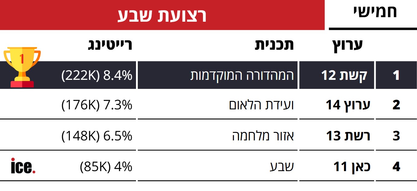 רייטינג: קשת 12 משאירה אבק למתחרים, הפטריוטים וערוץ 14 בהישג