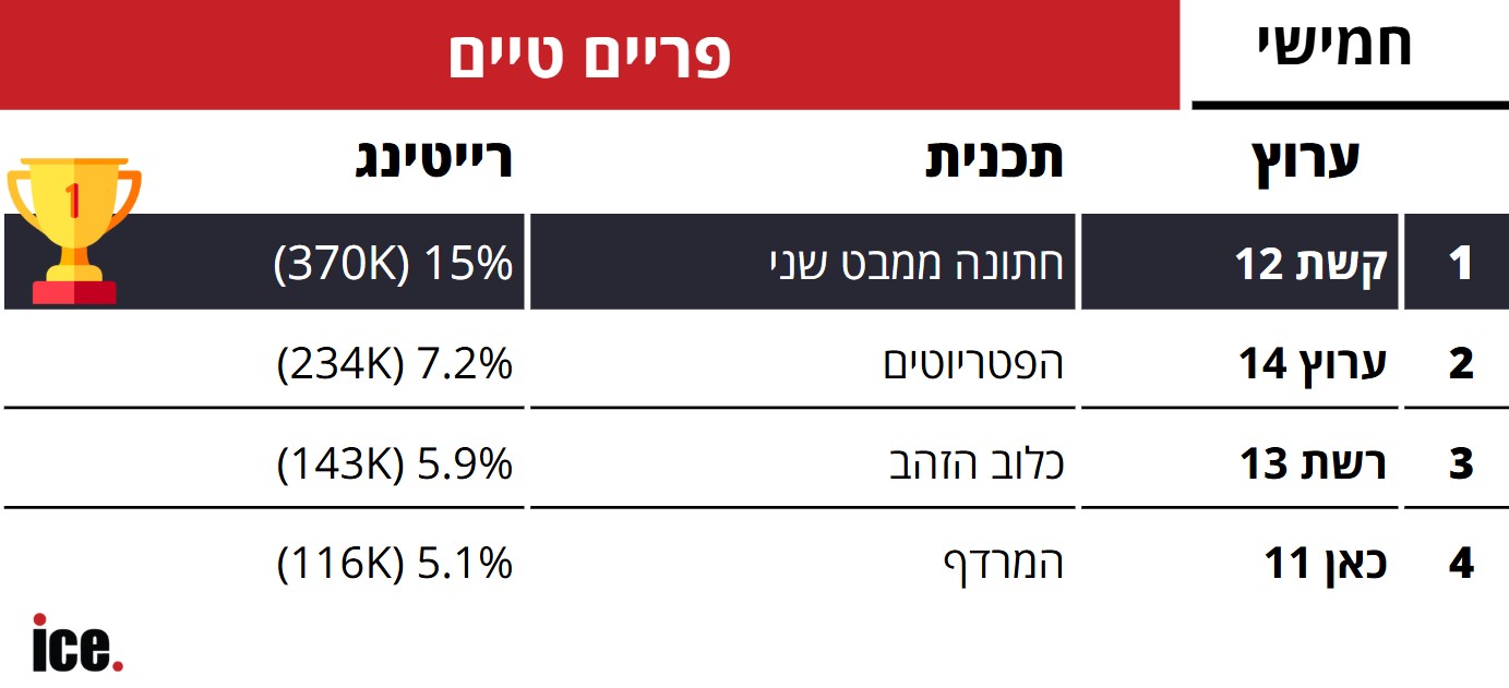הקרב על הרייטינג בין הערוצים הגדולים בישראל נמשך אתמול (חמישי) כאשר בגזרת הפריים טיים, קשת 12 מנצחת ובגדול אחרי שחתונה ממבט שני השיגה 15% (370 אלף צופים). הפטריוטים בערוץ 14 רשמו נתונים יפים גם הם עם 7.2% (234 אלף צופים), אחריהם כלוב הזהב ברשת 13 עם 5.9% (143 אלף צופים) ובמקום האחרון המרדף בכאן 11 עם 5.1% (116 אלף צופים).