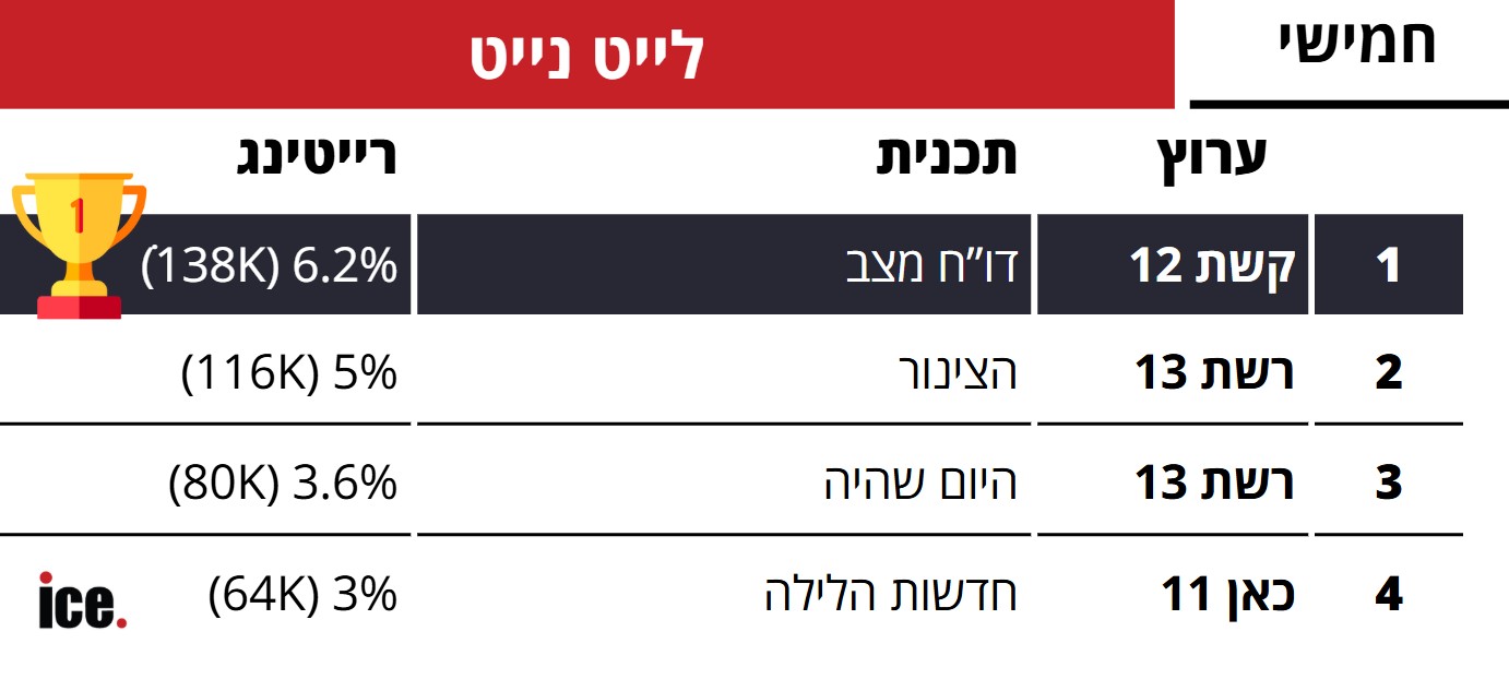 גם בלייט נייט, קשת 12 מנצחת אחרי שדו"ח מצב השיגה 6.2% (138 אלף צופים). במקומות השני והשלישי ממקומת רשת 13 עם התוכניות הצינור, שגרפה 5% (116 אלף צופים) והיום שהיה עם 3.6% (80 אלף צופים). חדשות הלילה בכאן 11 עם 3% (64 אלף צופים) ומשדר ההתרמה של ערוץ 14 עם 2% (56 אלף צופים).