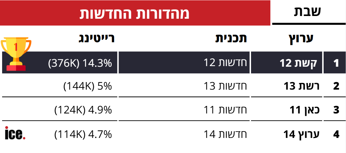 חדשות 12 שמובילה בפער ברור עם 14.3% נתח צפייה ו-376 אלף צופים. הפער בין המובילה לבין המתחרות משמעותי - חדשות 13 מגיעה למקום השני עם 5% נתח צפייה ו-144 אלף צופים, ואחריה בצמידות חדשות 11 עם 4.9% ו-124 אלף צופים. חדשות 14 סוגרת את הרבעייה עם 4.7% נתח צפייה ו-114 אלף צופים.