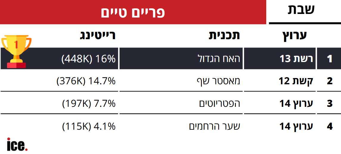 בפריים טיים התרחש קרב מעניין בין שתי התכניות המובילות, כאשר האח הגדול ברשת 13 זוכה בניצחון דחוק אך מרשים עם 16% נתח צפייה ו-448 אלף צופים בפרק פגישת המחזור, מול מאסטר שף בקשת 12 שהגיע ל-14.7% נתח צפייה ו-354 אלף צופים. הפטריוטים בערוץ 14 השיג ביצועים טובים עם 7.7% נתח צפייה ו-197 אלף צופים, ואחריו שער הרחמים באותו ערוץ עם 4.1% ו-115 אלף צופים. כאן 11 התפצל בין שיר אחד עם 3.5% נתח צפייה ו-85 אלף צופים, וש.ח כוורת נתתי לה חיי עם 3.2% ו-71 אלף צופים.