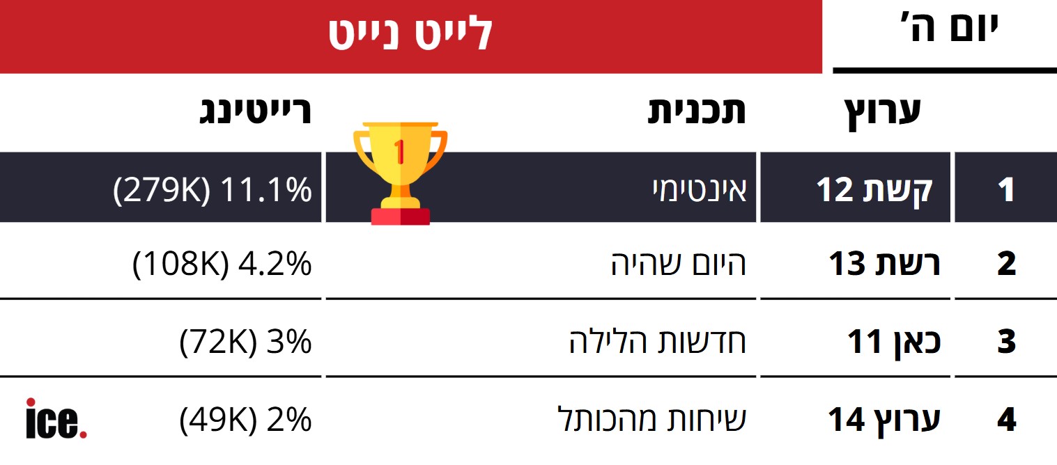 במבט על רצועת הלייט נייט, ניתן להבחין כי קשת ממשיכה להציג יציבות מרשימה. תוכנית הטלוויזיה "אינטימי", המשודרת בערוץ 12, השיגה 11.1% רייטינג ו-279 אלף צופים. אחריה, מופיעה רשת 13 עם התוכנית "היום שהיה" שגרפה 4.2% רייטינג ו-108 אלף צופים.
