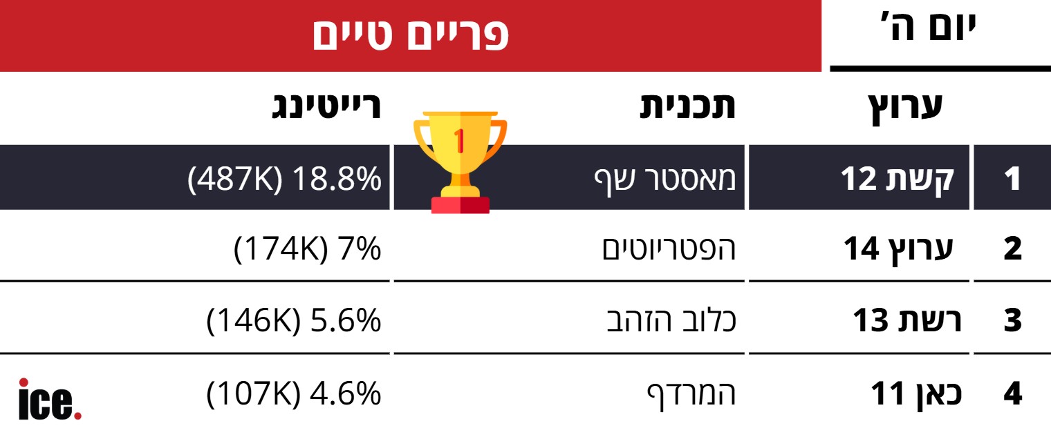 שבוע נוסף מגיע לסיומו ועמו מתפרסמים נתוני הרייטינג של תוכניות ששודרו אמש (חמישי) בערוצי הטלוויזיה בישראל. ברצועת הפריים טיים, מככבת קשת 12 בזכות תוכנית הטלוויזיה "מאסטר שף", בה משתתפים השפים רותי ברודו, ישראל אהרוני, אייל שני וחיים כהן. על פי הנתונים, תוכנית הבישול גרפה 18.8% רייטינג ו-487 אלף צופים.