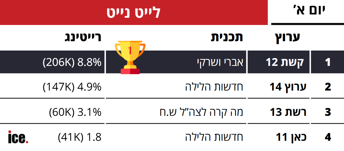 רצועת הלייט חזרה על הדפוס, כאשר "אברי ושרקי" בקשת השיגו 8.8% רייטינג ו-206 אלף צופים. "חדשות הלילה" בערוץ 14 הגיעה למקום השני עם 4.9% רייטינג ו-147 אלף צופים, ואחריה "ש.ח מה קרה לצה״ל" ברשת 13 עם 3.1% רייטינג ו-60 אלף צופים. "חדשות הלילה" בכאן 11 סגרה את הרשימה עם 1.8% רייטינג ו-41 אלף צופים.