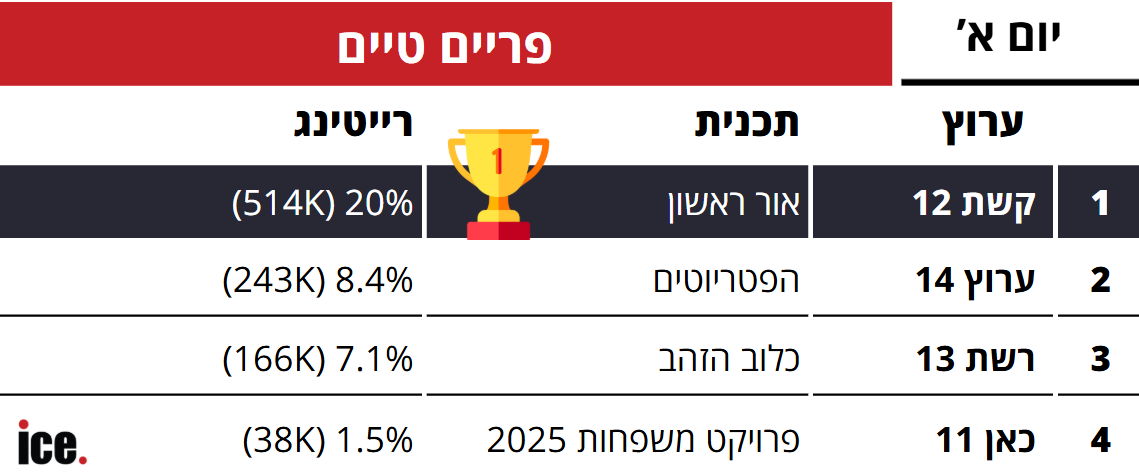 ברצועת הפריים טיים המרכזית, "אור ראשון" בקשת 12 להט בפרק הפתיחה עם 20% רייטינג מרשים ו-514 אלף צופים, כמעט פי שלושה מהתוכנית במקום השני. "הפטריוטים" בערוץ 14 הגיעה למקום השני עם 8.4% רייטינג ו-243 אלף צופים, ואחריה "כלוב הזהב" ברשת 13 עם 7.1% רייטינג ו-166 אלף צופים. "פרויקט משפחות 2025" בכאן 11 נאבקת בתחתית עם 1.5% רייטינג ו-38 אלף צופים בלבד.