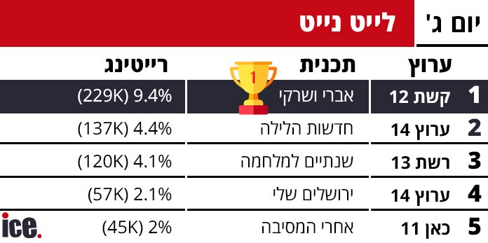 בגזרת הלייט נייט, קשת 12 בפסגה אחרי שאברי גלעד ויאיר שרקי השיגו 9.4% (229 אלף צופים). אחריהם חדשות הלילה בערוץ 14 עם 4.4% (137 אלף צופים). התוכנית שנתיים למלחמה ברשת 13 גרפה 4.1% (120 אלף צופים), ירושלים שלי בערוץ 14 עם 2.1% (57 אלף צופים) ובמקום האחרון אחרי המסיבה בכאן 11 עם 2% (45 אלף צופים).
