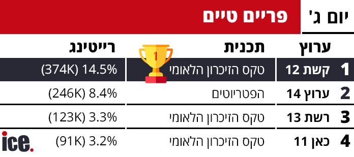 רייטינג: הפטריוטים וערוץ 14 מול טקס המשפחות לזכר ה-7.10