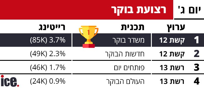 בגזרת רצועות הבוקר, משרד הבוקר בקשת 12 במקום הראשון עם 3.7% (85 אלף צופים), אחריו חדשות הבוקר של קשת 12 עם 2.3% (49 אלף צופים). פותחים יום ברשת 13 עם 1.7% (46 אלף צופים) והעולם הבוקר ברשת עם 0.9% (24 אלף צופים) בלבד.