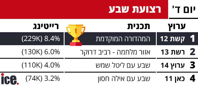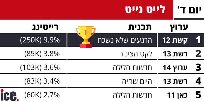 הפטריוטים, שכזכור לא שידרו את טקס הזיכרון של המשפחות ביום שלישי, המשיכו עם מהדורה לחג וזכו ל-7.3% רייטינג (227 אלף צופים). כלוב הזהב של רשת עם 3.9% רייטינג (99 אלף צופים) ושידור חוזר של שעשועון המרדף הניב לכאן 11 3.4% רייטינג (87 אלף צופים).