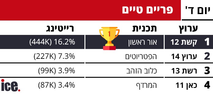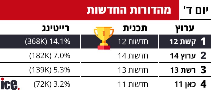 אתמול (רביעי), יממה לאחר שידור טקס הזיכרון ל-7 באוקטובר שאירגנו משפחות הנופלים והחטופים, לוח השידורים חזר לשגרה. הפרק השני של הסדרה השנויה במחלוקת "אור ראשון" מבית קשת הוביל את רצועת הפריים טיים וגרף נתון נאה - 16.2% רייטינג (444 אלף צופים) - אך נמוך מהפרק הראשון.
