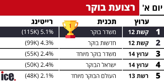 קשת 12 שלטה ברצועת הבוקר עם שתי תוכניות מובילות: "משדר בוקר" בהנחיית נסלי ברדה הגיע למקום הראשון עם 5.1% רייטינג ו-115 אלף צופים, ו"חדשות הבוקר" במקום השני עם 4.3% רייטינג ו-99 אלף צופים. ערוץ 14 הציג ביצועים נאים עם "על הבוקר" שרשם 2.6% רייטינג ו-60 אלף צופים במקום השלישי, ו"ישראל הבוקר" ב-2.4% רייטינג ו-50 אלף צופים. רשת 13 סגרה את הרשימה עם "משדר בוקר מיוחד" בהנחיית שי גולדן ב-2.4% רייטינג ו-55 אלף צופים, ו"העולם הבוקר מיוחד" עם 2.1% רייטינג ו-48 אלף צופים בלבד.