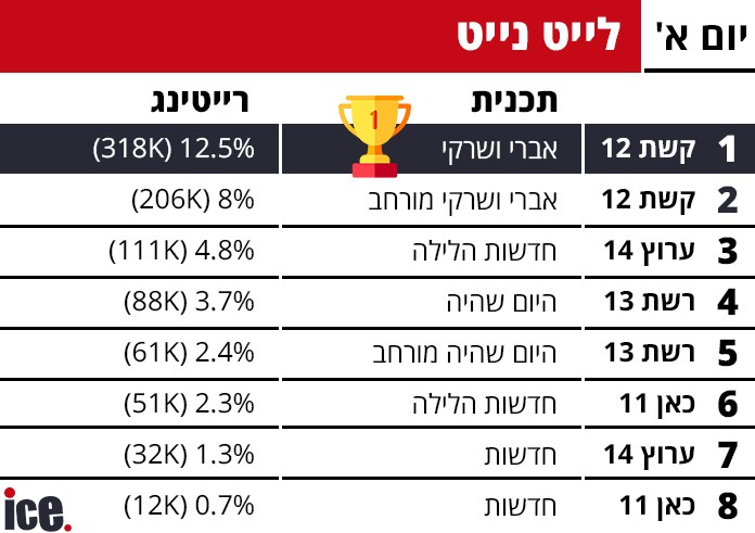 ברצועת הלילה המאוחרת, קשת 12 המשיכה את הדומיננטיות עם "אברי ושרקי" שהגיע ל-12.5% רייטינג ו-318 אלף צופים במקום הראשון, ו"אברי ושרקי מורחב" ב-8.0% רייטינג ו-206 אלף צופים. ערוץ 14 תפס את המקום השלישי עם "חדשות הלילה" ב-4.8% רייטינג ו-111 אלף צופים, ואחריו "חדשות" ב-1.3% רייטינג ו-32 אלף צופים. רשת 13 הגיעה למקום החמישי עם "היום שהיה" ב-3.7% רייטינג ו-88 אלף צופים, ו"היום שהיה מורחב" ב-2.4% רייטינג ו-61 אלף צופים. כאן 11 סגרה את הרצועה עם "חדשות הלילה" ב-2.3% רייטינג ו-51 אלף צופים, ו"חדשות" ב-0.7% רייטינג ו-12 אלף צופים בלבד.