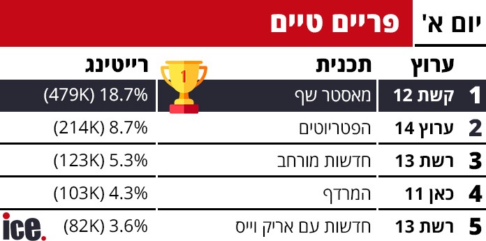 ברצועת הפריים טיים המכרעת, קשת 12 המשיכה את השליטה עם "מאסטר שף" שהגיע ל-18.7% רייטינג ו-479 אלף צופים - הנתון הגבוה ביותר בכל הערב. ערוץ 14 הציג ביצועים חזקים במקום השני עם "הפטריוטים" ב-8.7% רייטינג ו-214 אלף צופים. רשת 13 הגיעה למקום השלישי עם "חדשות מורחב" ב-5.3% רייטינג ו-123 אלף צופים, ואחריה "חדשות עם אריק וייס" ב-3.6% רייטינג ו-82 אלף צופים. כאן 11 סגרה את הרצועה עם "המרדף" ב-4.3% רייטינג ו-103 אלף צופים.