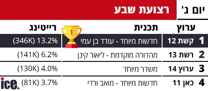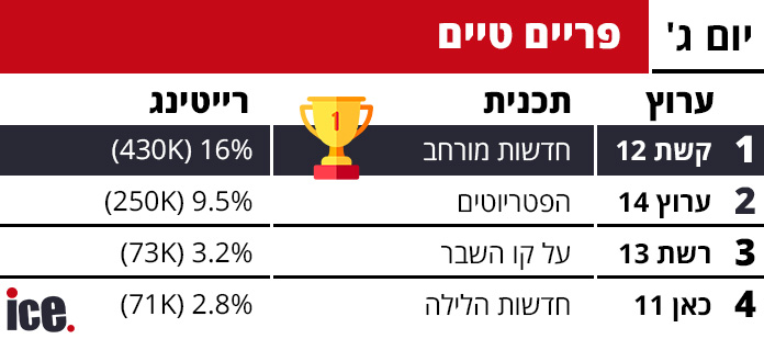 ברצועת הפריים טיים, חדשות 12 המשיכה את הדומיננטיות עם התוכנית "חדשות מורחב" שהגיעה ל-16% רייטינג ו-430 אלף צופים. במקום השני הגיע ערוץ 14 עם "הפטריוטים" ב-9.5% רייטינג ו-250 אלף צופים, ואילו רשת 13 עם "על קו השבר" סגרה את הטריו עם 3.2% רייטינג ו-73 אלף צופים בלבד.