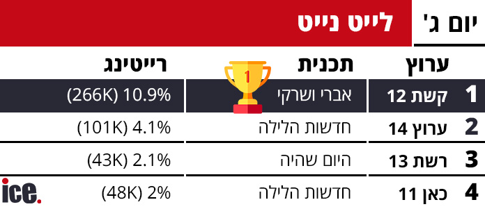 ברצועת הלייט המאוחרת, קשת 12 שוב מובילה עם "אברי ושרקי" שהגיע ל-10.9% רייטינג ו-266 אלף צופים. הפער מהמקום השני היה משמעתי כשערוץ 14 עם "חדשות הלילה": 4.1%, 101 אלף צופים, כאן 11 עם "חדשות הלילה": 2%, 48 אלף צופים ורשת 13 אחרונה עם "היום שהיה": 2.1%, 43 אלף צופים