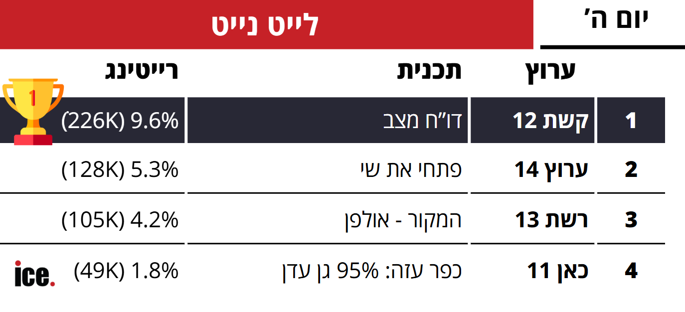 בלייט נייט, קשת ממשיכה להוביל עם נתון נאה של 9.6% רייטינג לתכנית "דו"ח מצב (226 אלף צופים). "פתחי את שי" של ערוץ 14 הגיע ל-5.3% רייטינג (128 אלף צופים). אולפן "המקור" זכה ל-4.2% רייטינג (105 אלף צופים).