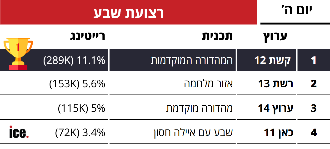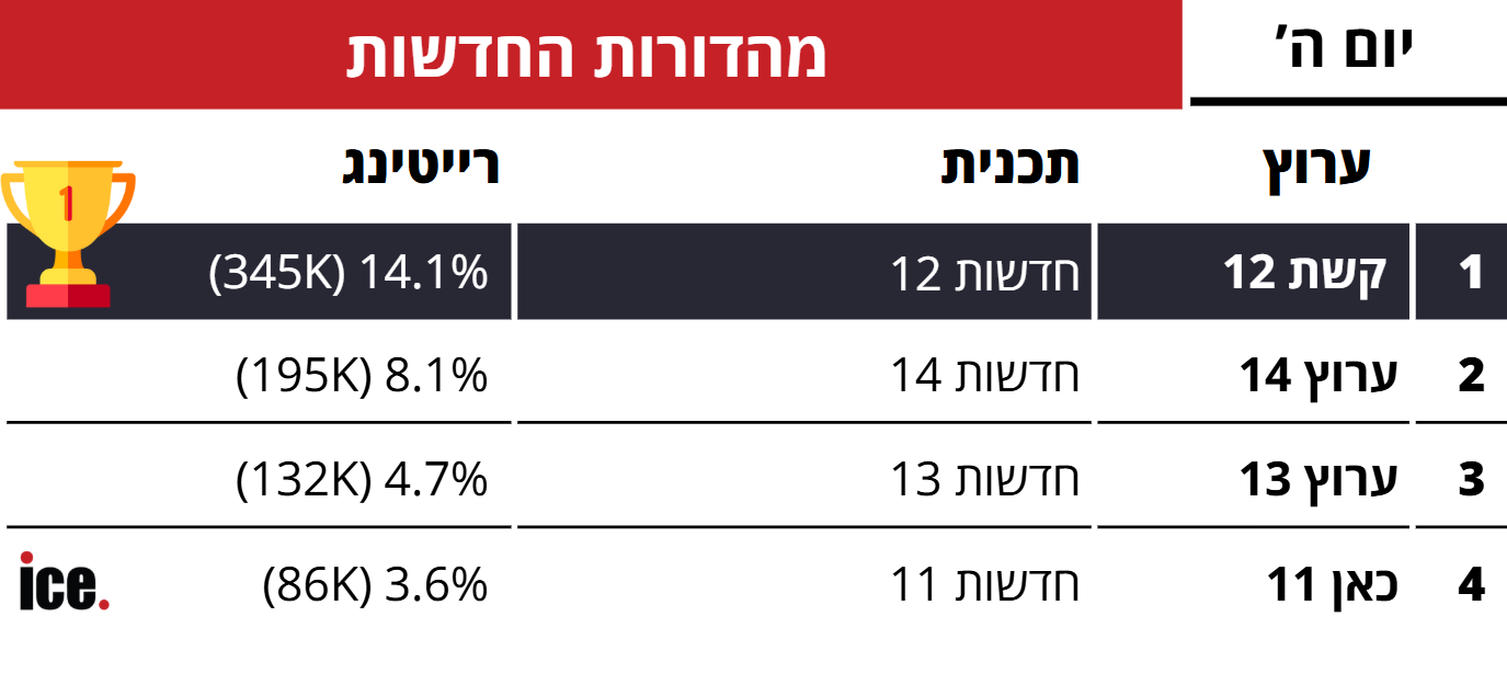 לאחר שבוע בו הציבור הישראלי היה מרותק למסכי החדשות, אתמול (חמישי) נרשמה נסיגה מסוימת. בחדשות 12 המגישים המרכזיים נחו וקרן מרציאנו תפסה את ההובלה והגיעה ל-14.1% רייטינג (345 אלף צופים).