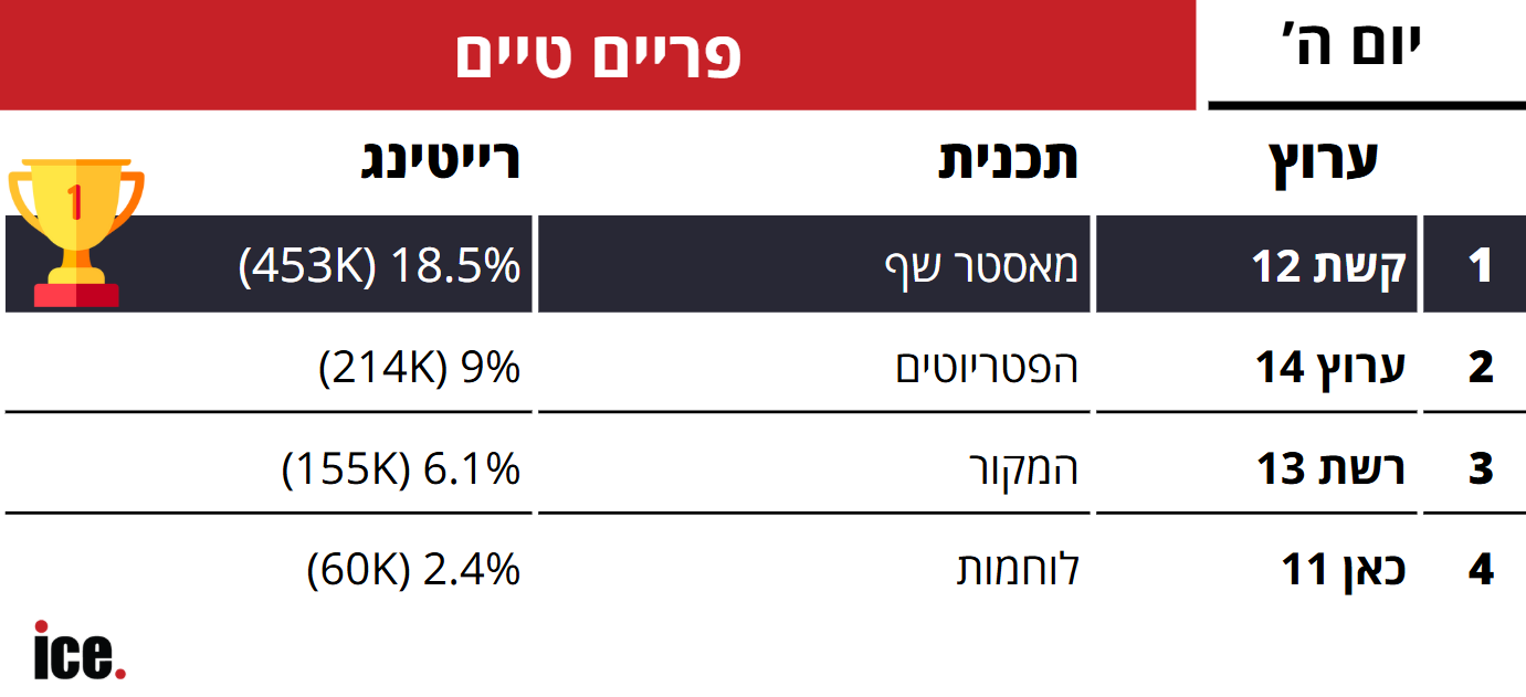 ברצועת הפריים טיים, נתוני הרייטינג הגבוהים נשמרו. "מאסטר שף" של קשת כיכבה עם 18.5% רייטינג (453 אלף צופים). תכנית "המקור" של רביב דרוקר על "הרבש"צ שהפך לאשם" הניבה לערוץ 6.1% רייטינג (155 אלף צופים), לא מספיק כדי לנצח את "הפטריוטים" של ינון מגל שבלטו עם 9% רייטינג (214 אלף צופים).