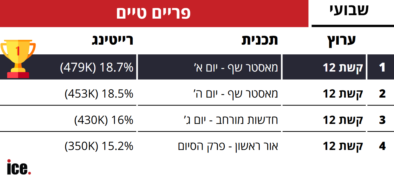 כנראה שישראלים ממש אוהבים תכניות בישול. עונת "מאסטר שף" החדשה של קשת 12 מציגה ממוצע גבוה, ולא ירדה השבוע מרף ה-18.5% רייטינג. ברצועת הפריים טיים, פרק מאסטר שף ששודר ביום א' היה לנצפה ביותר - 18.7% רייטינג (479 אלף צופים).