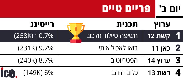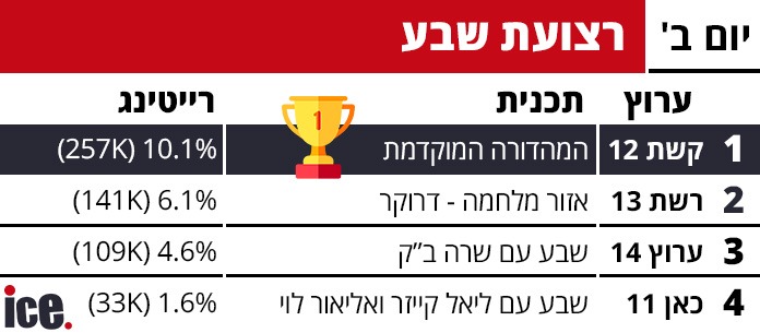 קשת 12 פשוט בלתי ניתנת לעצירה. הערוץ ממשיך להוביל בלי שום הפרעה מול הפטריוטים של ערוץ 14. מסתבר שדווקא הריאליטי הצנוע של כאן בואו לאכול איתי מצליח לאיים על הפסגה.