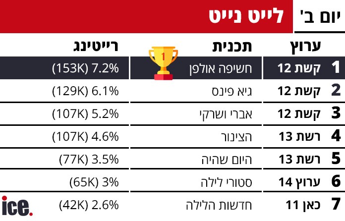 ברצועת הלייט, "חשיפה אולפן" בקשת 12 הוליכה עם 153,000 צופים ורייטינג של 7.2%. "גיא פינס" בקשת 12 הגיעה שנייה עם 129,000 צופים ורייטינג של 6.1%, ואחריה "אברי ושרקי" באותו ערוץ עם 107,000 צופים ורייטינג של 5.2%. "הצינור" ברשת 13 צברה 107,000 צופים ברייטינג של 4.6%, "היום שהיה" ברשת 13 הגיעה ל-77,000 צופים ברייטינג של 3.5%, "סטורי לילה" בערוץ 14 עם 65,000 צופים ורייטינג של 3%, ו"חדשות הלילה" בכאן 11 סגרה עם 53,000 צופים ורייטינג של 2.6%.