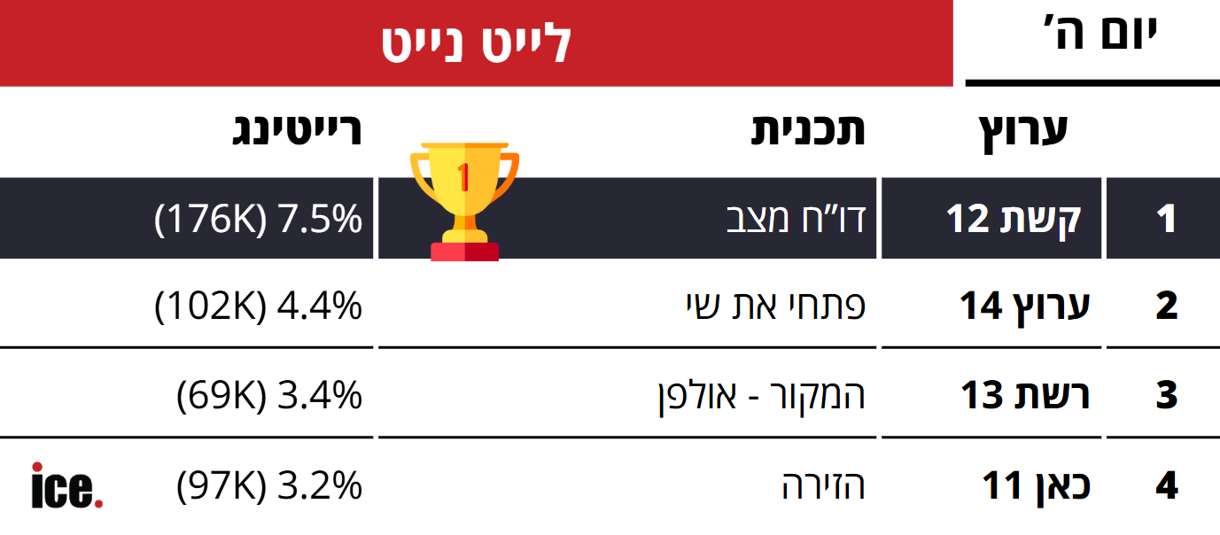 בלייט נייט, "דו"ח מצב" של קשת הובילה עם 7.5% רייטינג (177 אלף צופים), לקט הצינור של רשת השיג 2.9% רייטינג (61 אלף צופים) ואת המקום השני.