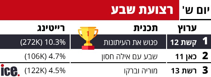 ברצועת 19:00, "פגוש את העיתונות" בקשת 12 שלטה בצורה מוחלטת עם 10.3% רייטינג ו-273 אלף צופים. "מוריה וברקו שבת" ברשת 13 הגיעה ה-3 אך עם ביצועים מאכזבים יחסית - 4.5% רייטינג ו-121 אלף צופים בלבד, נתון שמעלה סימני שאלה בעוד בכאן 11 איילה חסון הפתיעה ודילגה מעליהם עם 4.7% ו-106 אלף צופים.