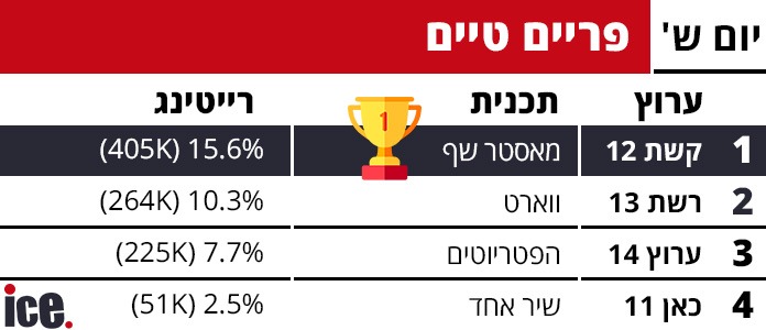 ריאליטי הבישול עם 15.6% רייטינג ו-405 אלף צופים עבור קשת 12 פער משמעותי מול המתחרות. תוכנית הבכורה של רשת 13, "ווארט", הפתיעה לטוב בבכורה והגיעה למקום השני עם 10.3% רייטינג ו-264 אלף צופים, הישג מרשים למהדורה ראשונה.