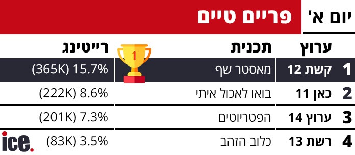 ברצועת הפריים טיים, "מאסטר שף" בקשת 12 המשיכה לשבור שיאים עם 15.7% רייטינג ו-365 אלף צופים - הישג מרשים שמותיר את כל המתחרות רחוק מאחור. "בואו לאכול איתי" בכאן 11 הגיעה למקום השני עם 8.6% רייטינג ו-222 אלף צופים, הישג טוב במיוחד לערוץ הציבורי. "הפטריוטים" בערוץ 14 רשמה 7.3% רייטינג עם 200 אלף צופים, ואחריה "פתחי את שי" באותו ערוץ עם 4.8% רייטינג ו-124 אלף צופים. "הזירה" בכאן 11 הגיעה ל-4.4% רייטינג עם 113 אלף צופים, ואילו "כלוב הזהב" ברשת 13 נותרה מאחור עם 3.5% רייטינג ו-83 אלף צופים בלבד.