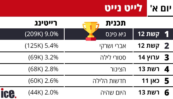 ברצועת הלייט, קשת 12 המשיכה לשלוט עם "גיא פינס" שקלטה 9.0% רייטינג ו-209 אלף צופים - הישג מצוין לתוכנית לילה. "אברי ושרקי" באותה רשת הגיעה ל-5.4% רייטינג עם 125 אלף צופים. "סטורי לילה" בערוץ 14 רשמה 3.2% רייטינג עם 69 אלף צופים, "הצינור" ברשת 13 הגיעה ל-2.8% רייטינג ו-68 אלף צופים, "חדשות הלילה" בכאן 11 רשמה 2.6% רייטינג עם 60 אלף צופים, ו"היום שהיה" ברשת 13 סגרה את הרשימה עם 2.0% רייטינג ו-44 אלף צופים בלבד.