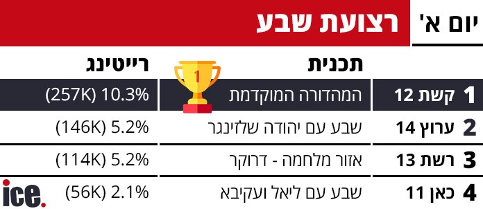 קשת 12 המשיכה אתמול (ראשון) בשליטה המוחלטת שלה ברייטינג בכל רצועות השידור. רשת 13 פשוט התרסקה ואפילו כאן 11 הצליחה לעקוף אותה במהדורת החדשות ולסיים עבורה ערב לא קל. ומה עשו בשקט בשקט הפטריוטים?