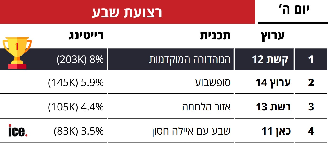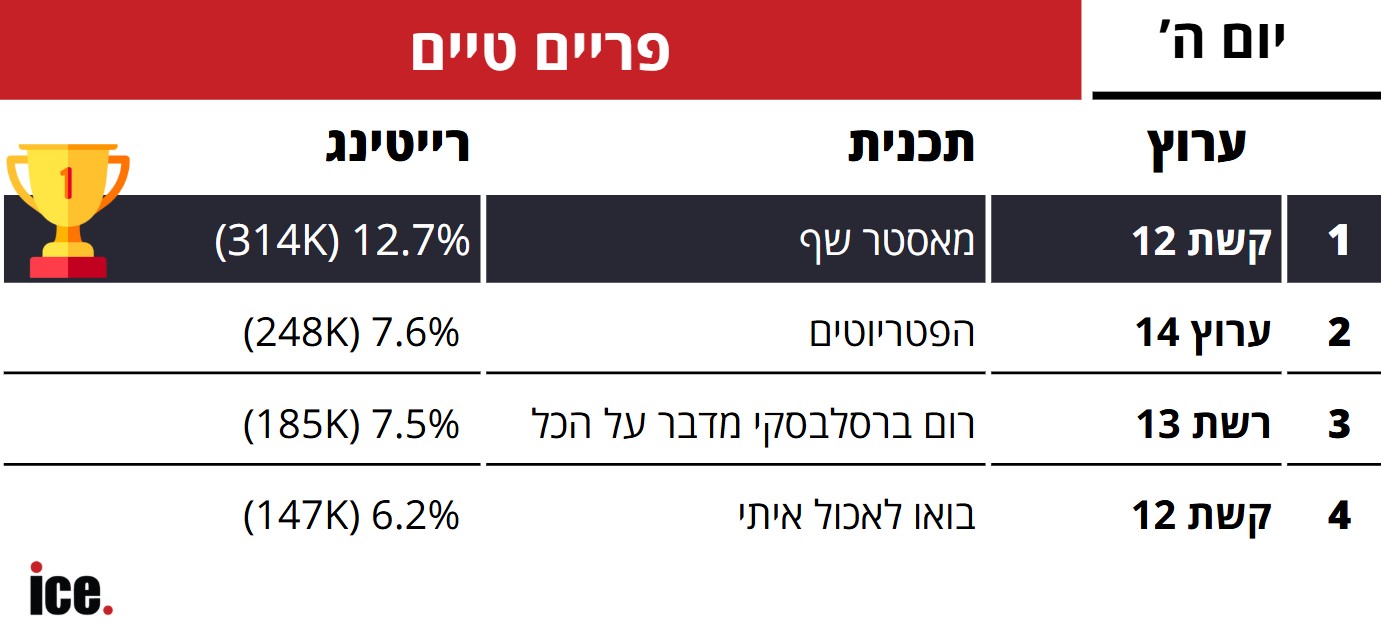 הקרב על הרייטינג בין הערוצים הגדולים בישראל נמשך בגדול. בגזרת הפריים טיים, מאסטר שף וקשת 12 בפסגה עם 12.7% (314 אלף צופים), כאשר הפטריוטים בערוץ 14 ממשיכים להשיג נתונים מרשימים עם 7.6% (247 אלף צופים). ממש בצמוד אליהם, הראיון המרתק של שורד השבי רום ברסלבסקי ברשת 13 עם 7.5% (185 אלף צופים). במקום האחרון בואו לאכול אותי בכאן 11 עם 6.3% (145 אלף צופים).